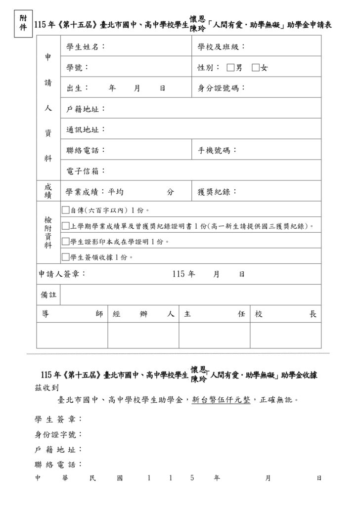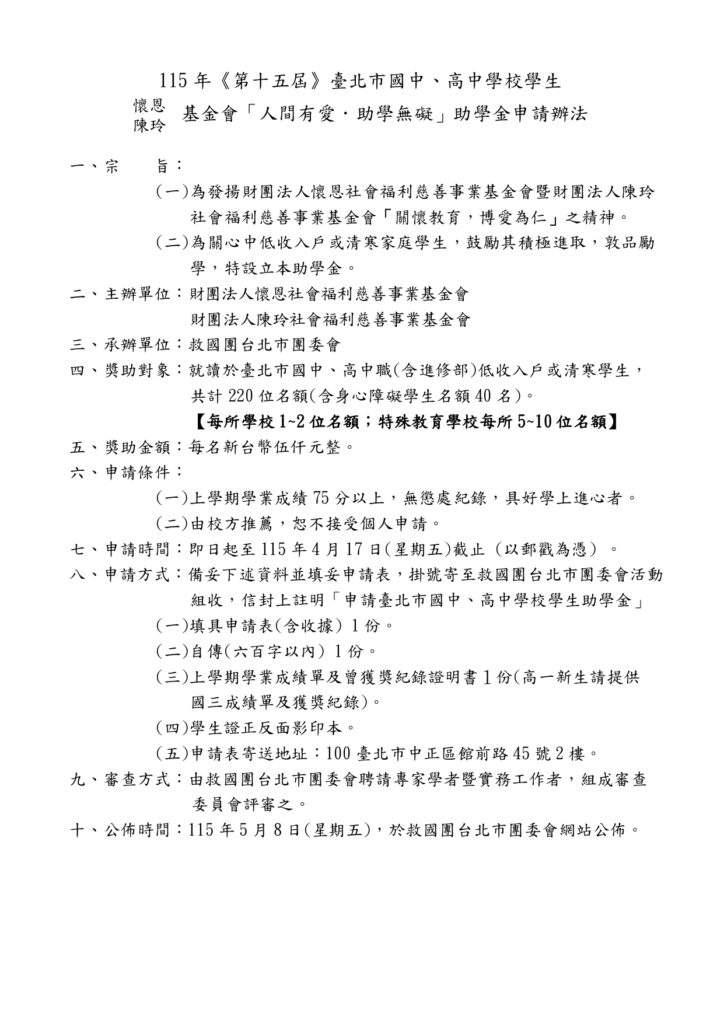 115年懷恩陳玲基金會清寒獎助學金申請辦法
